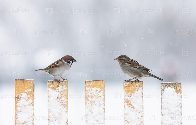 Два забавных птичьих воробья сидят на деревянном заборе напротив друг друга зимой в деревенском саду под падающим снегом