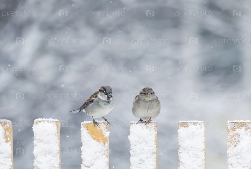 Два маленьких воробья зимой сидят на деревянном заборе в деревенском саду под падающим снегом