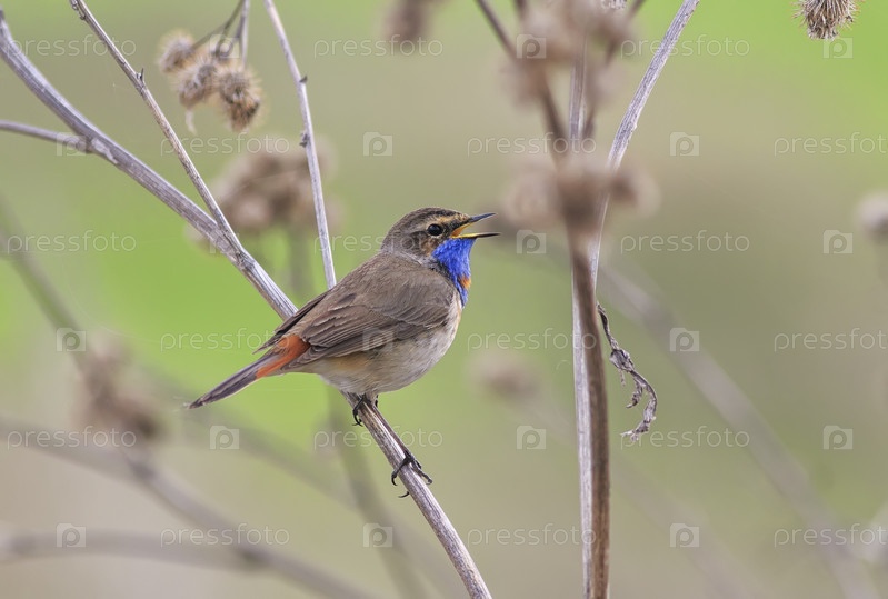 Красивый самец певчей птицы варакушка сидит на ветвях лопуха и поет