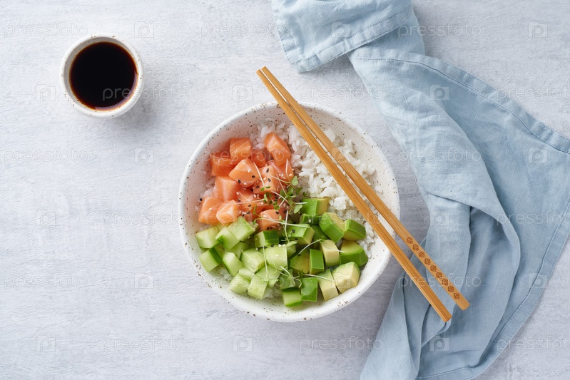 Поке из лосося со свежей рыбой, рисом, огурцом, авокадо