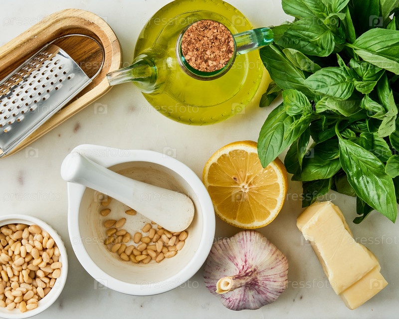 Приготовление ингредиентов соуса песто. Листья базилика, сыр пармезан, чеснок, кедровые орехи, оливковое масло, лимон
