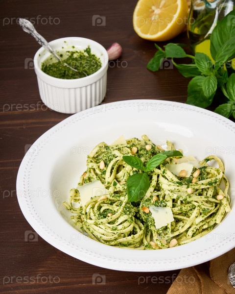 Итальянское песто тальятелле с кедровыми орешками, чесноком, листьями базилика, сыром пармезан, лимоном и оливковым маслом