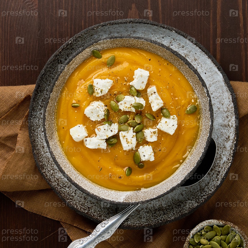 Деревенский крем-суп из тыквы с сыром фета, семечками и приправами. Домашнее пюре