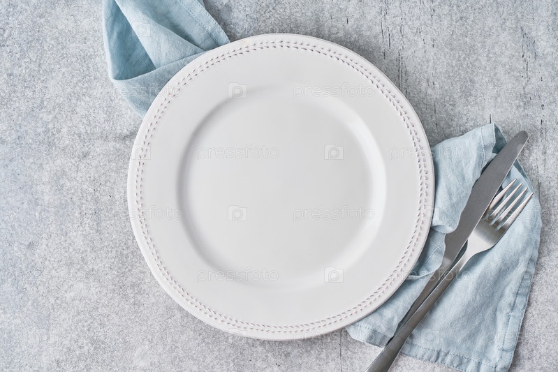 Пустая чистая белая круглая тарелка на фоне серой льняной скатерти с серебром