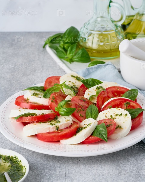 Рецепт итальянского салата капрезе с соусом песто. Питание детокс питание. Вертикальный