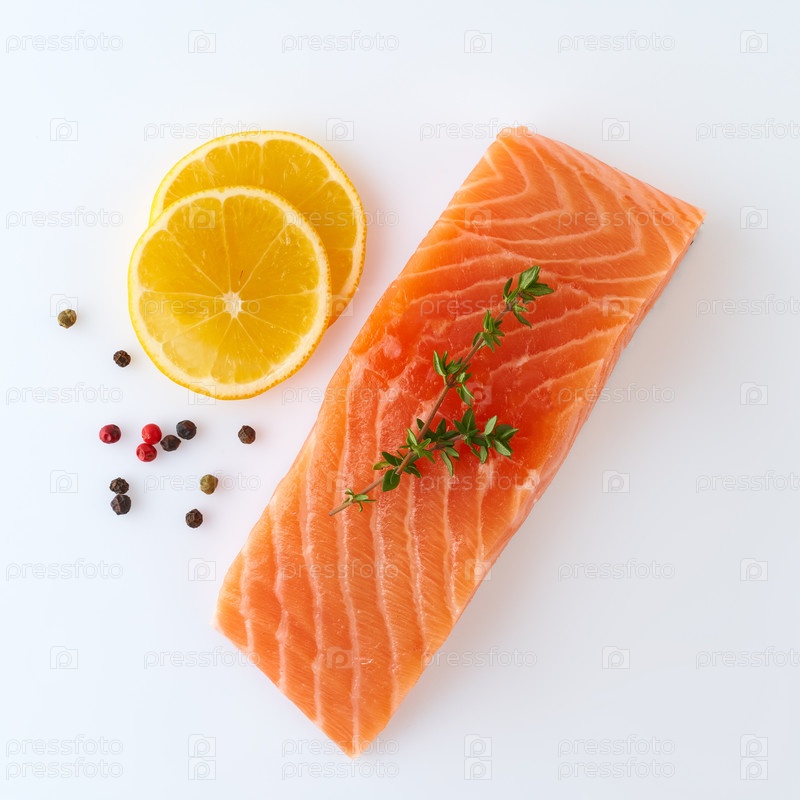 Свежее сырое сырое филе лосося, ломтик стейка, рыба на белом фоне с приправой и лимоном