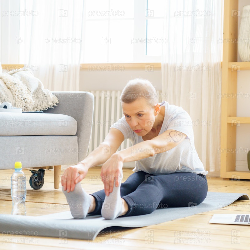 Пожилая женщина протягивает руки к ногам. Балансирующие упражнения йоги