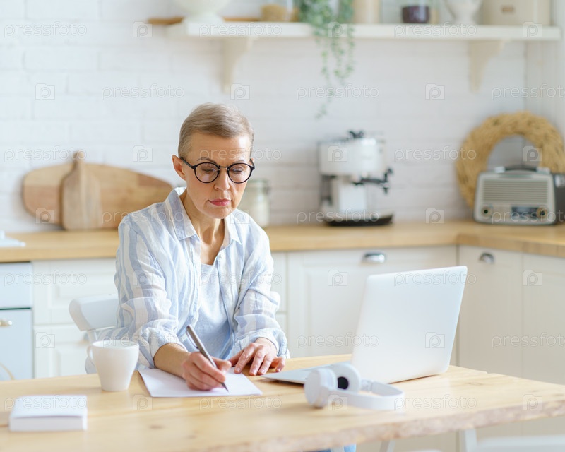 Сконцентрированная пожилая женщина-писатель печатает что-то на ноутбуке, работая в Интернете из дома