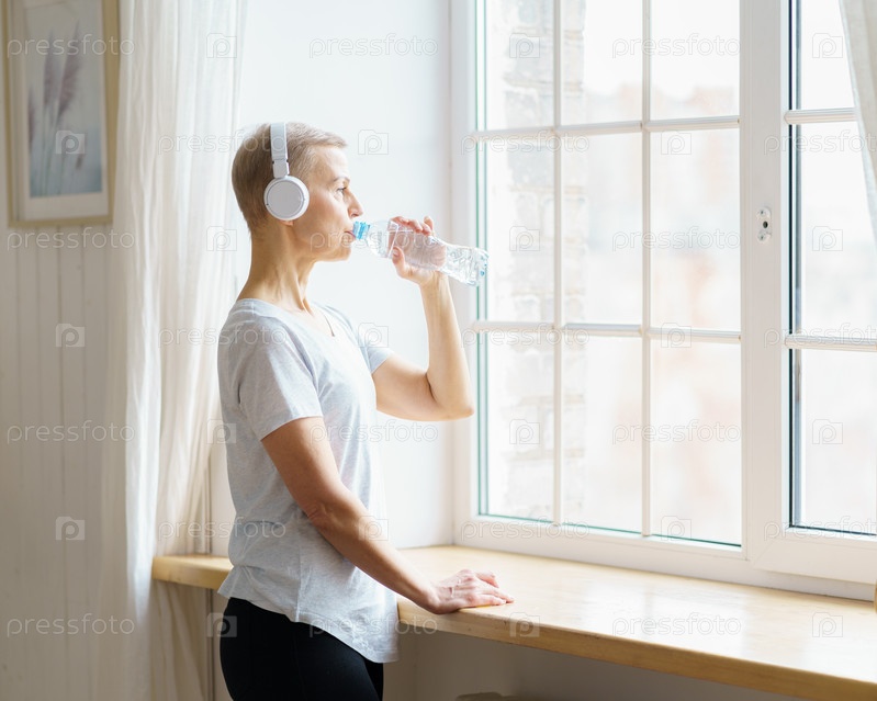 Счастливая пожилая женщина пьет воду из пластиковой бутылки после спортивной тренировки