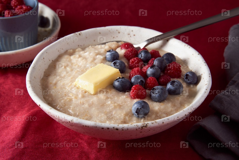 Овсяная каша с черникой, черникой. Завтрак в белой миске и ложке со свежими ягодами