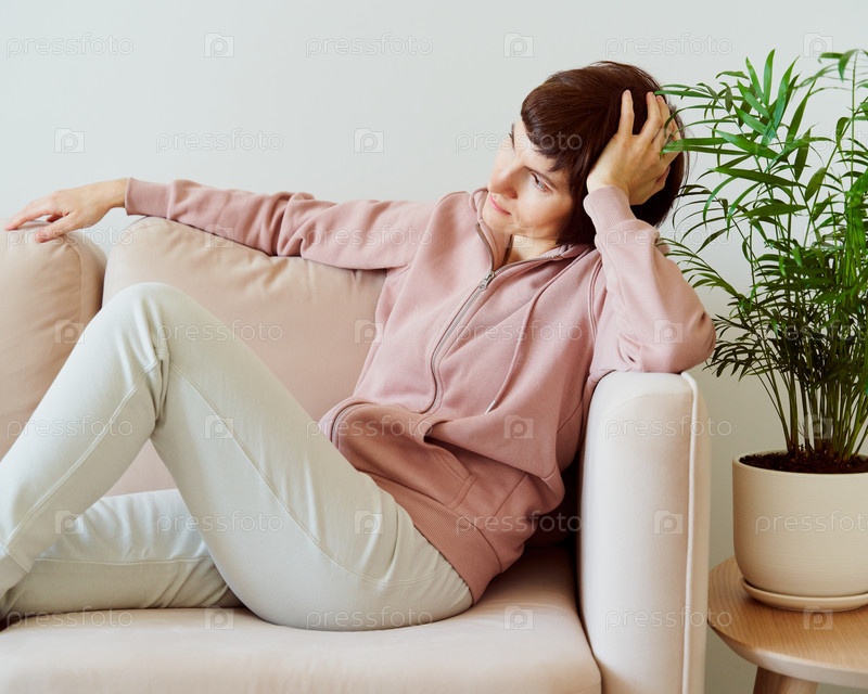 Зрелая женщина проводит время дома, в гостиной, лежит на диване и выглядит грустной. Концепция цифровой детоксикации, свободное время по выходным субботам и воскресеньям. Самопогружение. Расслабление и размышления
