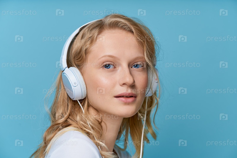 Крупным планом вид сбоку портрет молодой женщины, слушающей музыку через наушники на цветной ярко-синей стене