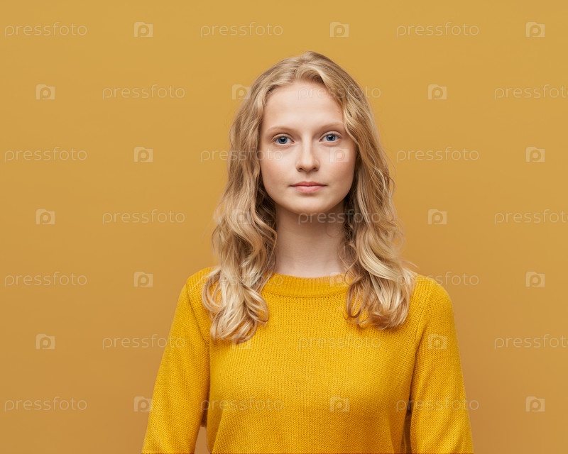 Талия портрет красивой молодой серьезной умной блондинки скандинавской женщины на ярко-желтой оранжевой стене
