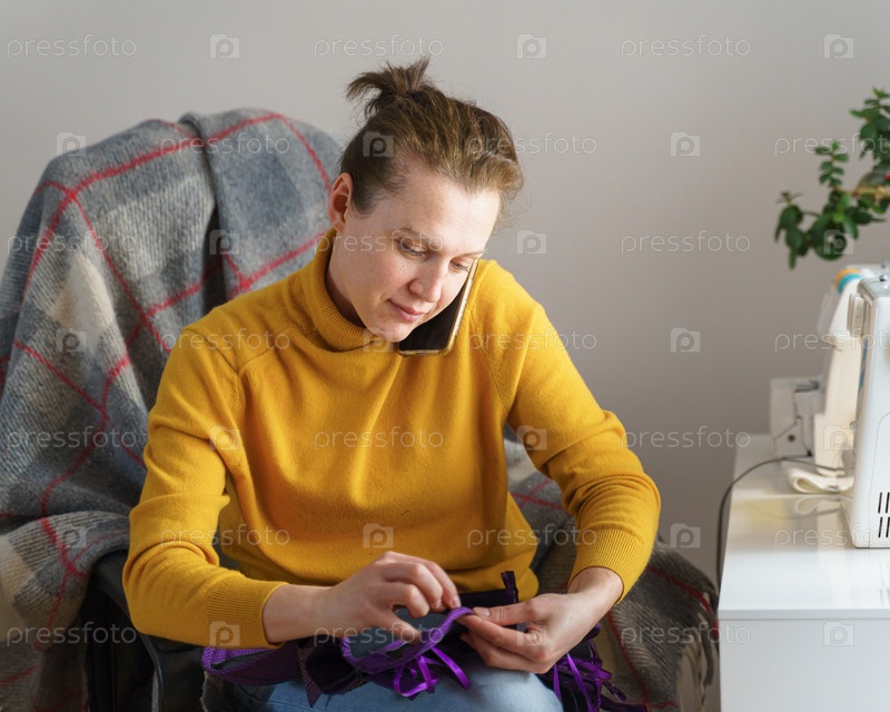 Занятая швея разговаривает по мобильному телефону во время шитья одежды на своем рабочем месте дома