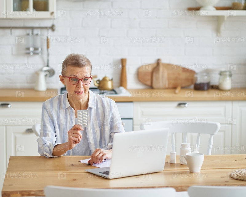 Пожилая женщина разговаривает онлайн с врачом во время covid 19, сидя дома на кухне