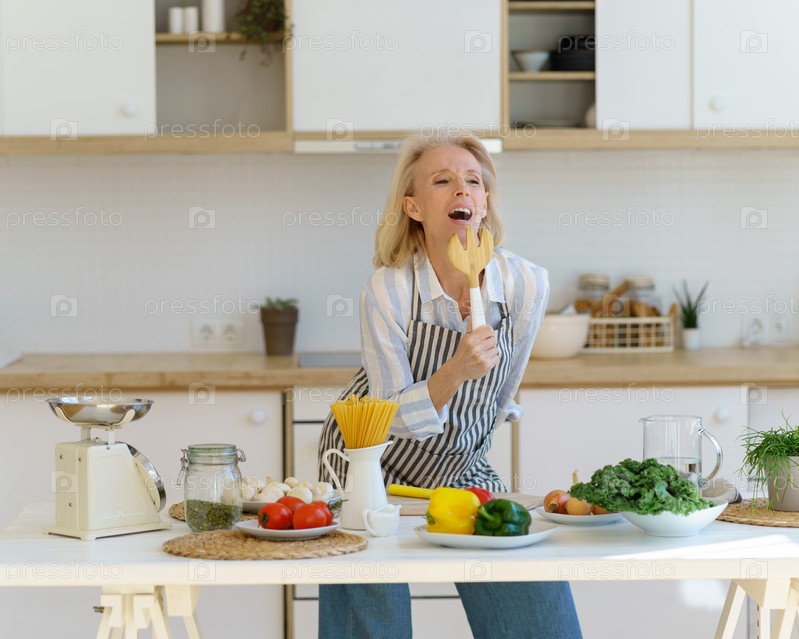Беззаботная пожилая женщина развлекается во время приготовления пищи на легкой современной кухне дома