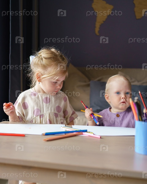 Двое детей, сестра и маленький брат, рисуют карандашами вместе дома