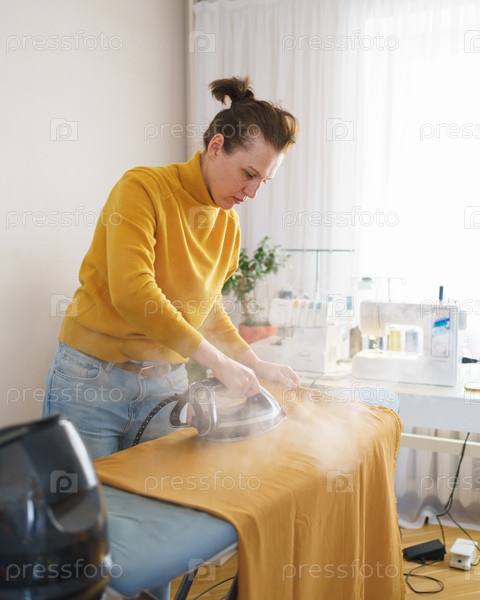 Женщина-швея гладит оранжевую ткань во время работы на своем рабочем месте