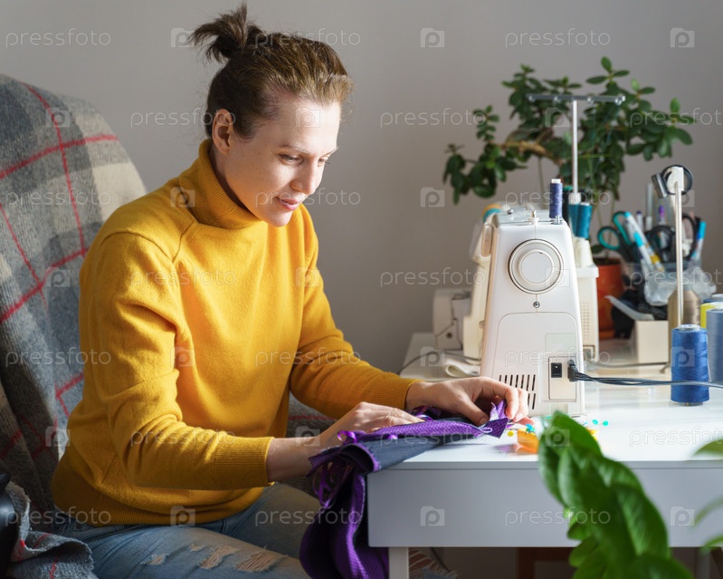 Счастливая швея смотрит на будущую одежду, работая удаленно на своем рабочем месте дома