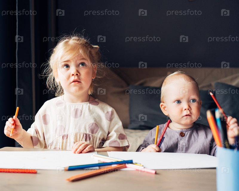 Двое детей, сестра и маленький брат, рисуют карандашами вместе дома
