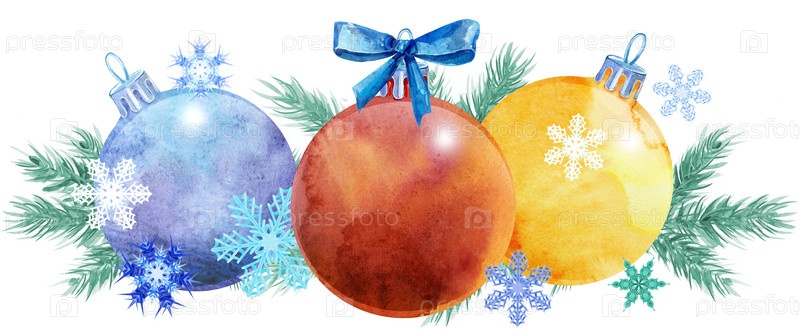 Акварель границы елки из шаров со снежинками. Карта для вашего творчества