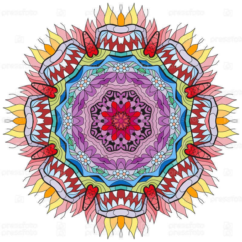 Декоративные круглые украшения. Необычная форма цветка. Восточный вектор, схемы антистрессовой терапии. Переплетение элементов дизайна. Вектор логотипов йоги