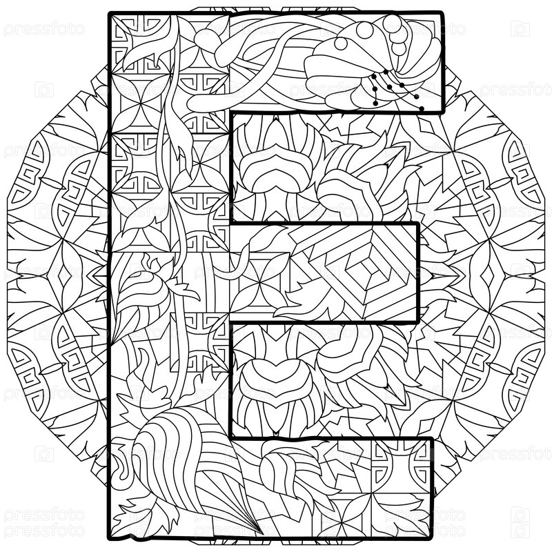 Zentangle стилизованный алфавит - буква E на мандале. векторная иллюстрация для окраски. этнический шаблон