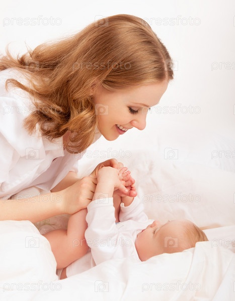 Счастливая семья. Мать играет с ребенком в постели