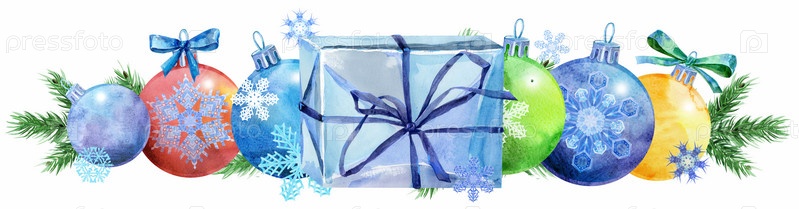 Акварельная граница елки из шаров со снежинками и подарком. Карта для вашего творчества