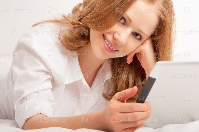 Женщина отдохает дома с планшетным компьютером