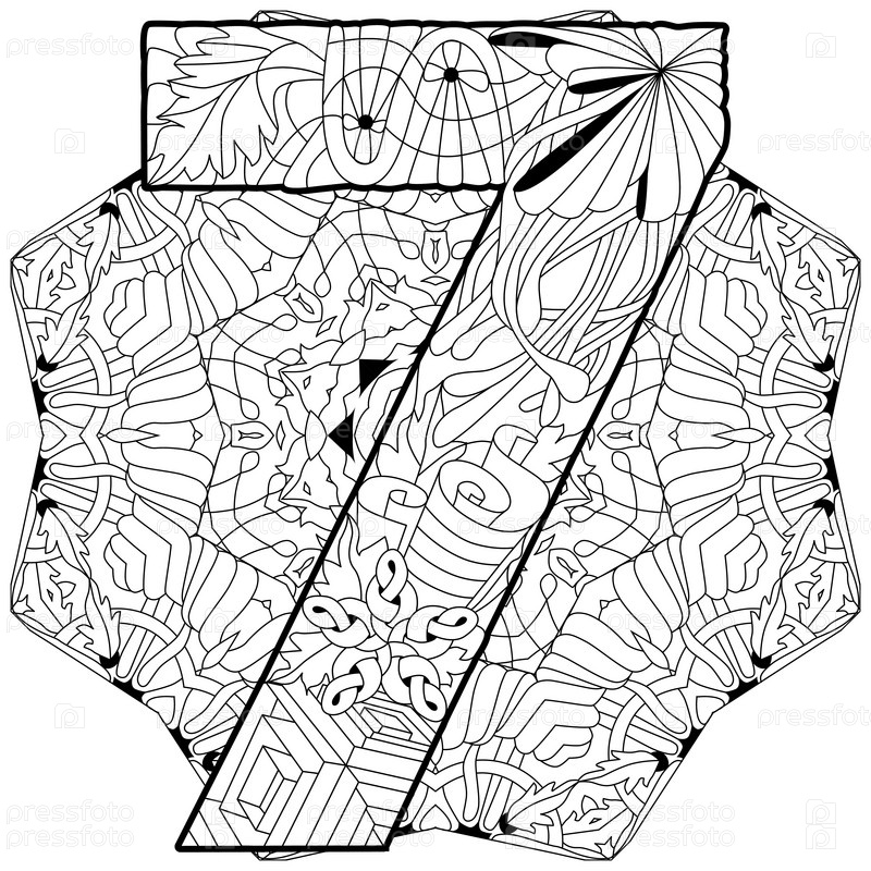 7-значный винтажный шрифт на мандале для раскраски. Дизайн гравировки. Векторная иллюстрация