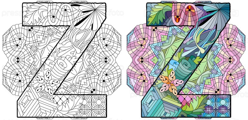 Zentangle стилизованный алфавит - буква Z на мандале для окраски. Векторная иллюстрация. Набор цветов и контуров