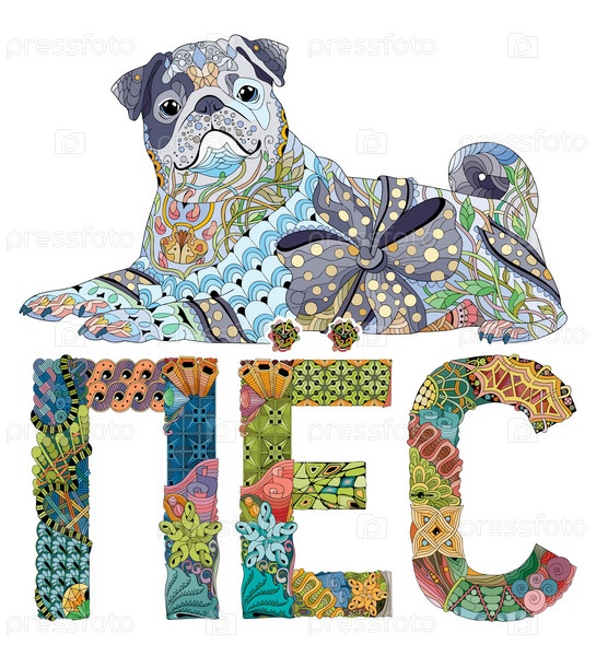 Художественный дизайн ручной росписи. Ручной рисунок слова СОБАКА на русском языке с фигурой собаки для футболки и других украшений