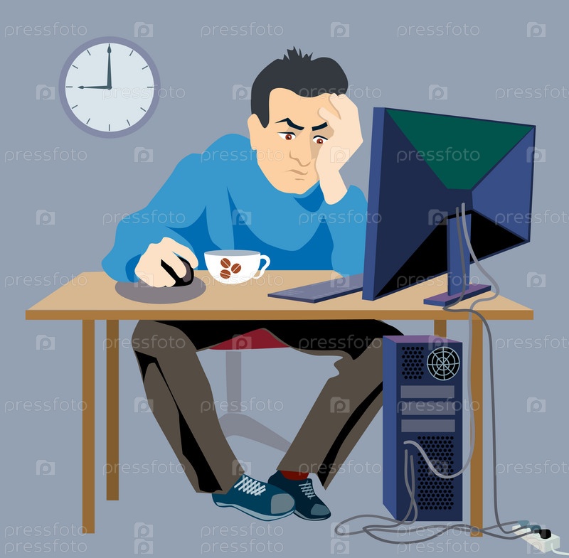 Мужчина сидит за компьютером допоздна на работе