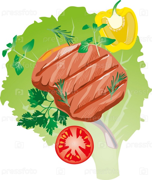 Вкусное мясо на гриле на листьях салата с помидорами и сладким перцем с орегано, петрушкой, розмарином