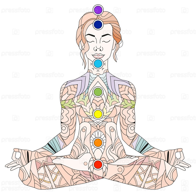 Йога. Женский богато украшенный силуэт, сидящий в позе лотоса над декоративным цветком, этническое искусство. Медитация, кундалини, тантра, аюрведа, аура и чакры. Векторная иллюстрация. Изолированные на белом фоне