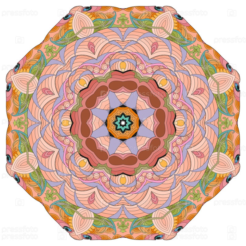 Декоративные круглые украшения. Необычная форма цветка. Восточный вектор, схемы антистрессовой терапии. Переплетение элементов дизайна. Вектор логотипов йоги