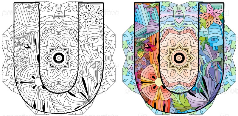 Zentangle стилизованный алфавит - буква U с мандалой для окраски. векторная иллюстрация. этнический узор