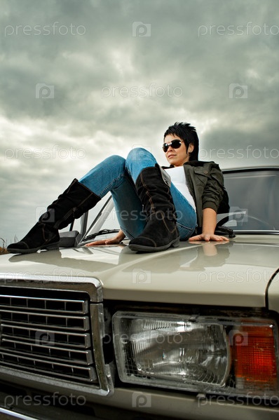 Женщина с машиной на фоне серного неба
