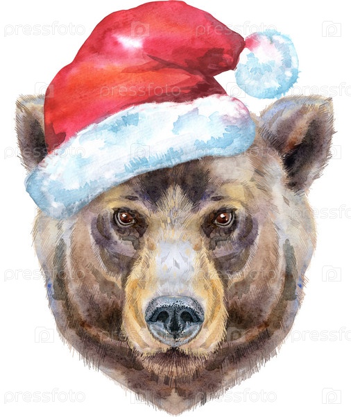 Портрет медведя в шапке Санты. Иллюстрация акварели бурого медведя. Прекрасный мир дикой природы