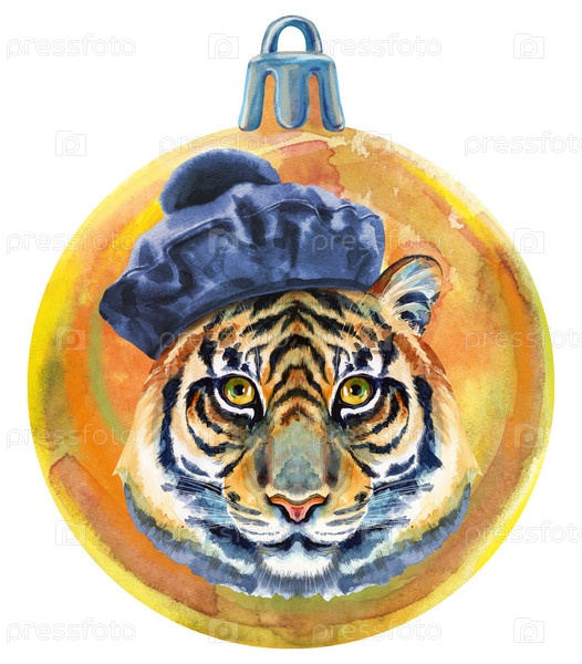 Акварель желтый Рождественский бал с тигром, изолированные на белом фоне