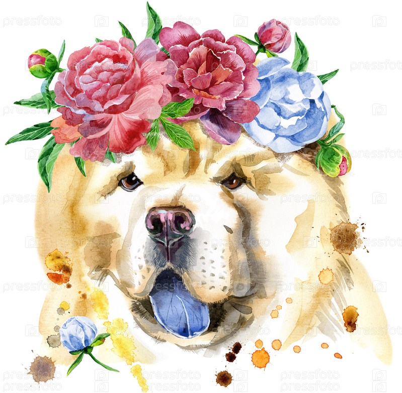 Симпатичная собака в венке из пионов. Графика на футболках с собаками. акварель чау-чау собака иллюстрация