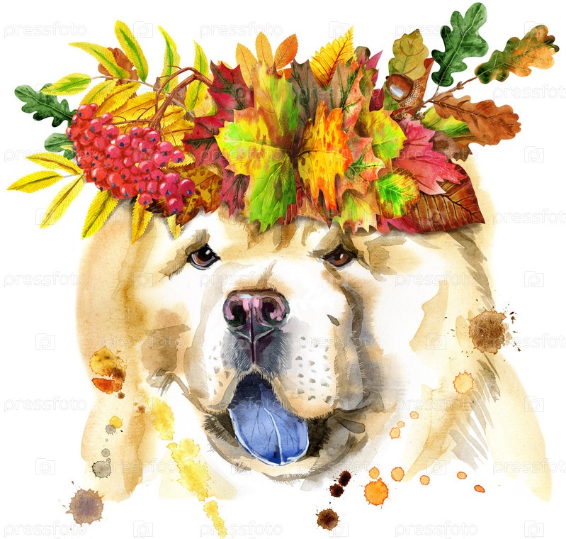 Симпатичная собака с венком из листьев. Графика на футболках с собаками. акварель чау-чау собака иллюстрация