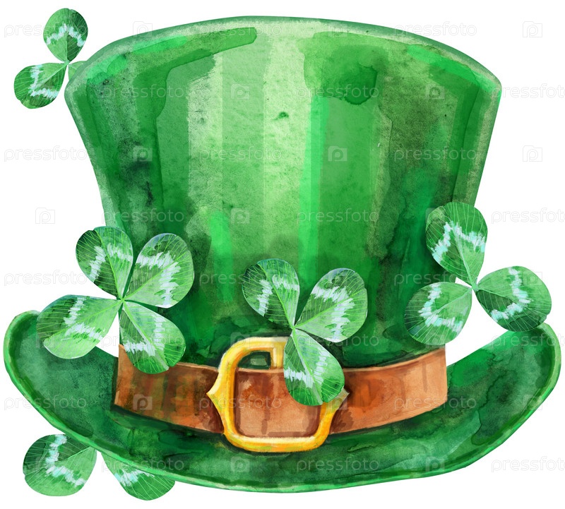 Зеленая шляпа лепрекона с листьями клевера на белом фоне
