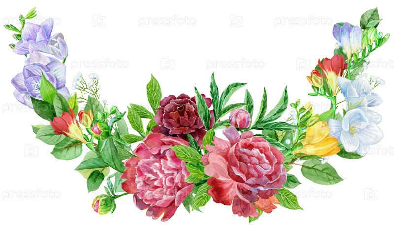 Ручная цветочная граница. Элемент дизайна свадебных приглашений, открыток. Фрезия и пионы