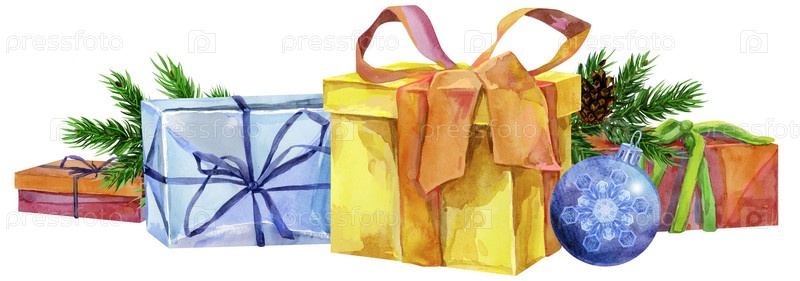 Акварельная рождественская иллюстрация с подарочными коробками. Для дизайна, печати или фона