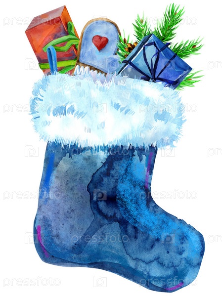 Рождественский синий носок с подарками на белом фоне. Акварель рисованной иллюстрации
