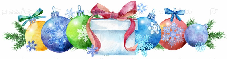Акварельная граница елки из шаров со снежинками и подарком. Карта для вашего творчества