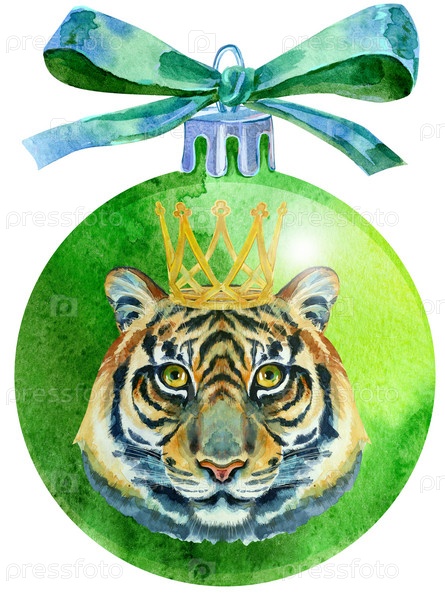 Акварель зеленый Рождественский бал с луком и тигром, изолированные на белом фоне