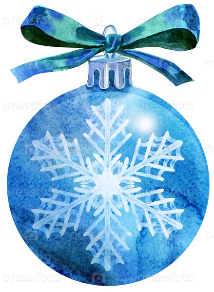 Акварель Рождественский синий шар с бантом, изолированные на белом фоне